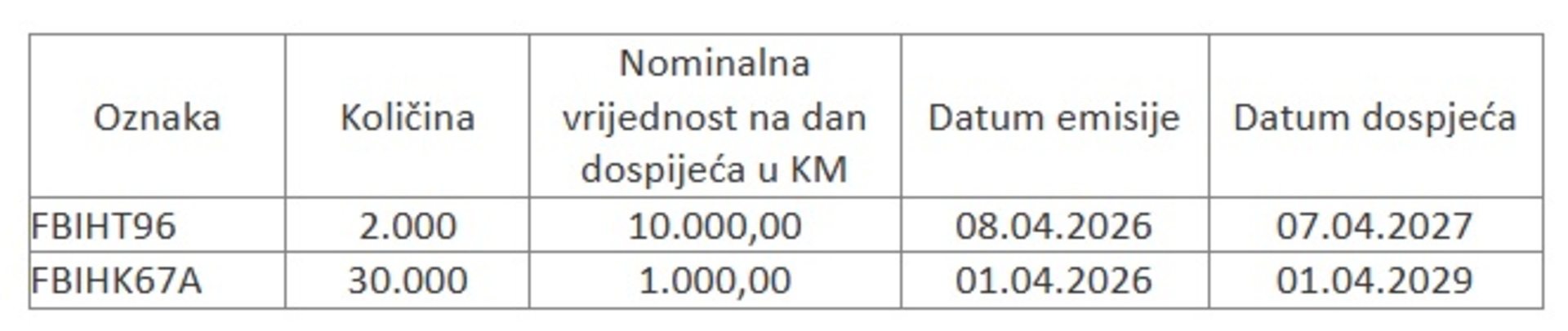 Riječ je o emisiji 2.000 trezorskih zapisa nominalne vrijednosti 10.000 KM po dospijeću, s rokom otplate do aprila 2027. godine, te 30.000 obveznica nominalne vrijednosti 1.000 KM, koje dospijevaju u aprilu 2029. godine.